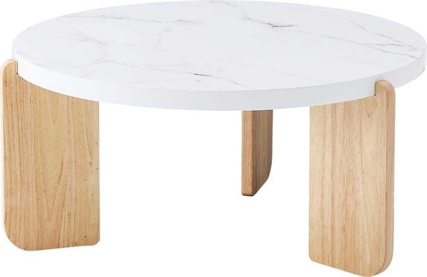 大理石調天板と天然木を組み合わせたラウンドテーブル 優しい色味と角の丸いフォルムが特徴的な、シンプルで落ち着いたラウンドテーブル。大理石調の天板と、天然木の脚部は異素材がMIXされたデザイン。2サイズ展開なので、組み合わせてネストテーブルとしてもお使いいただけます。