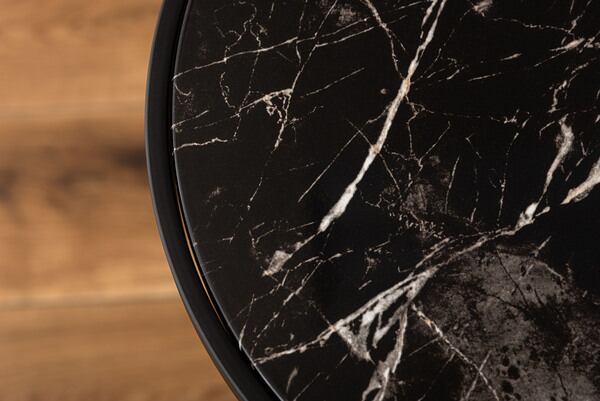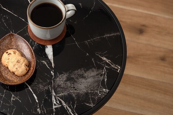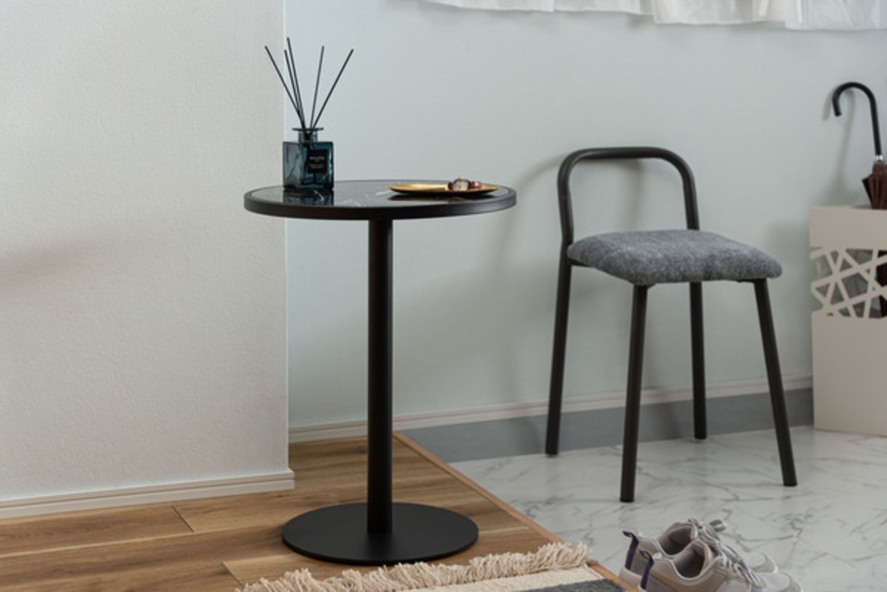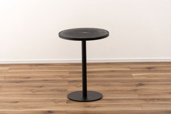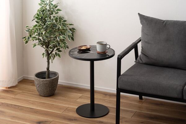 落ち着いた佇まいが印象的なサイドテーブル。ブラックスチールの脚が凛とした印象を与え、艶やかな石目調の天板が空間に深みを添えます。シンプルなデザインなので、様々なインテリアにすんなりとなじみ、空間にほどよいアクセントを加えます。 上品な色味と素材感が調和し、上質で洗練された印象を演出します。