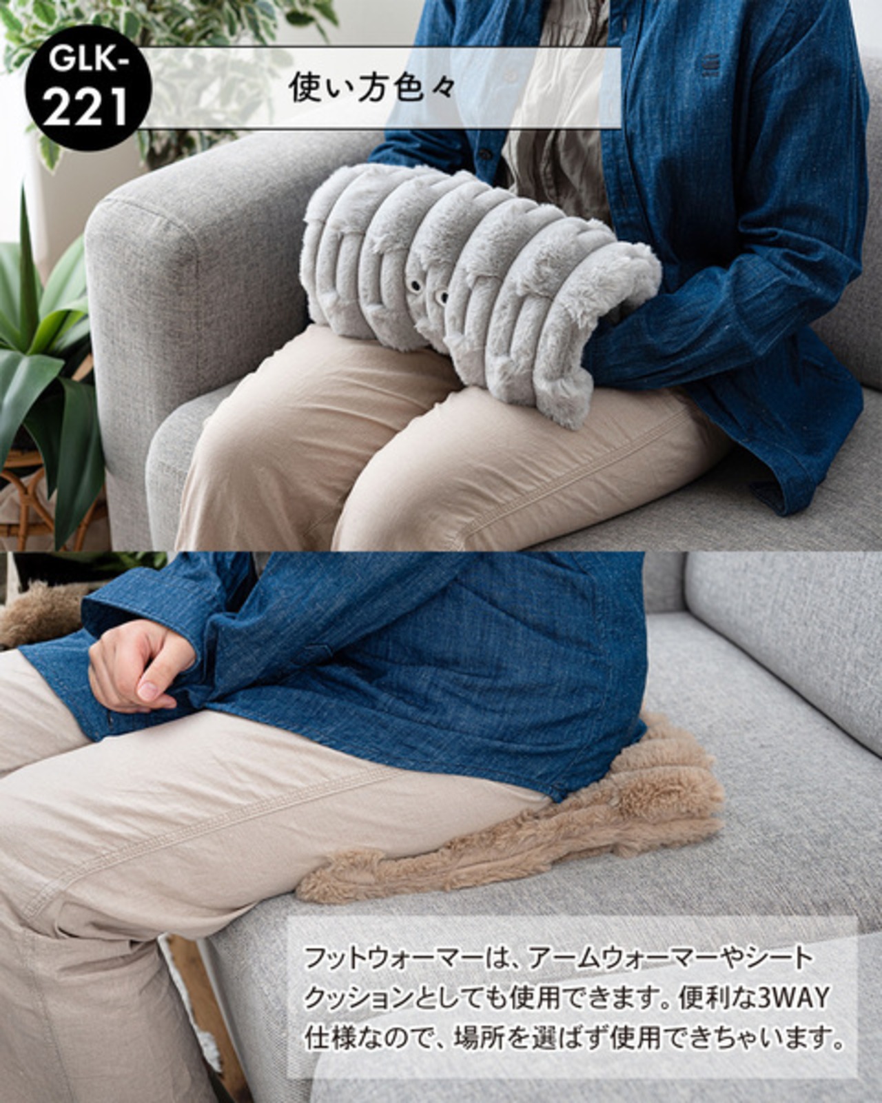 ●フットウォーマー以外に、アームウォーマーやシートクッションとしても使用可能。