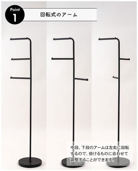 ●中段と下段のアームは左右に回転し、掛けるものに合わせて調整が可能。