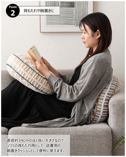 ●直径約34cmのほど良い大きさなので、ソファの背もたれ用として、読書用の腕置きクッションとしても便利。