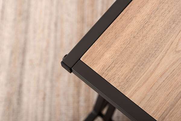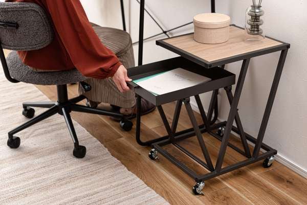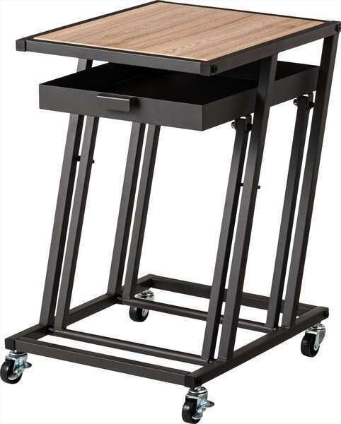 シャープなスチールフレームと木目調の天板が魅力のサイドテーブル。