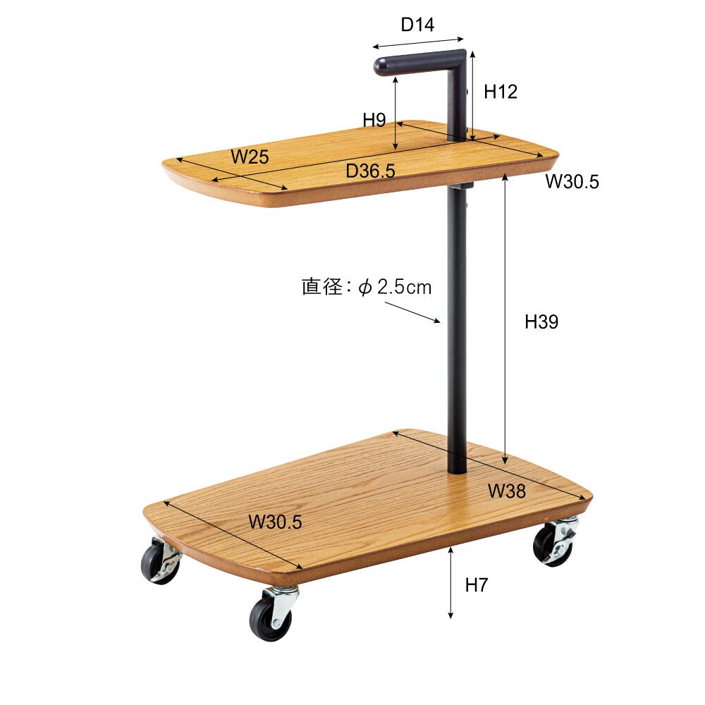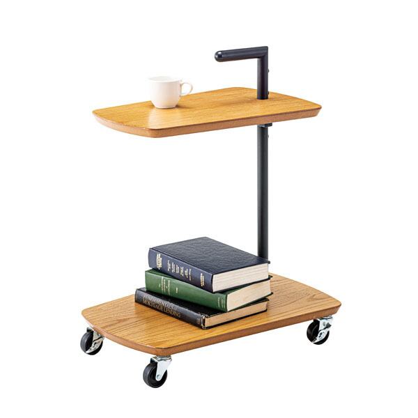 ■北欧風でシンプルなデザインのサイドテーブル。コンパクトサイズなので様々な用途で活躍。■キャスター付きなので移動もスムーズ。ストッパーも付いているので固定させておくこともできます。■天然木オーク(突板仕様)の豊かな表情を感じる天板とスチール素材とのバランスが絶妙な北欧デザイン。天板上のパイプはハンドル形状になっているので移動時に便利な仕様。■上の棚板にはマグカップやボトル類を、下の棚板にはバスケットやゴミ箱等を置ける使いやすい設計。■下の棚板は床から9cmの高さなので、ソファやベッドの下に入りやすいサイズ。手元に引き寄せて使える便利なサイドテーブル。